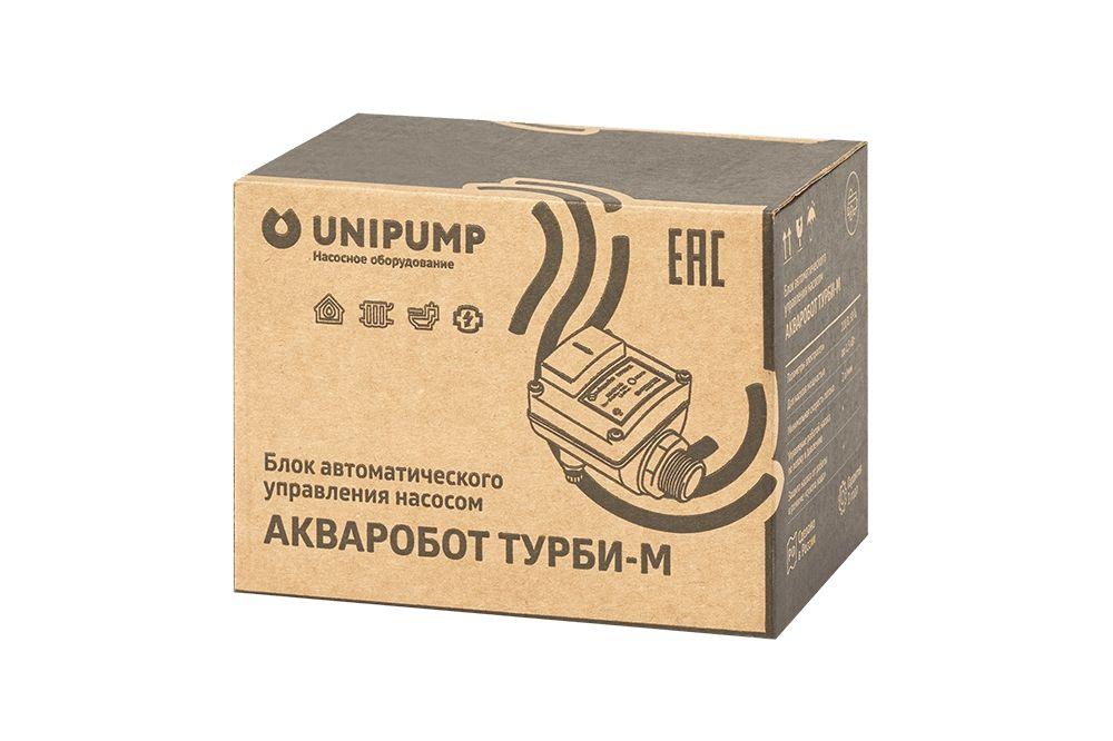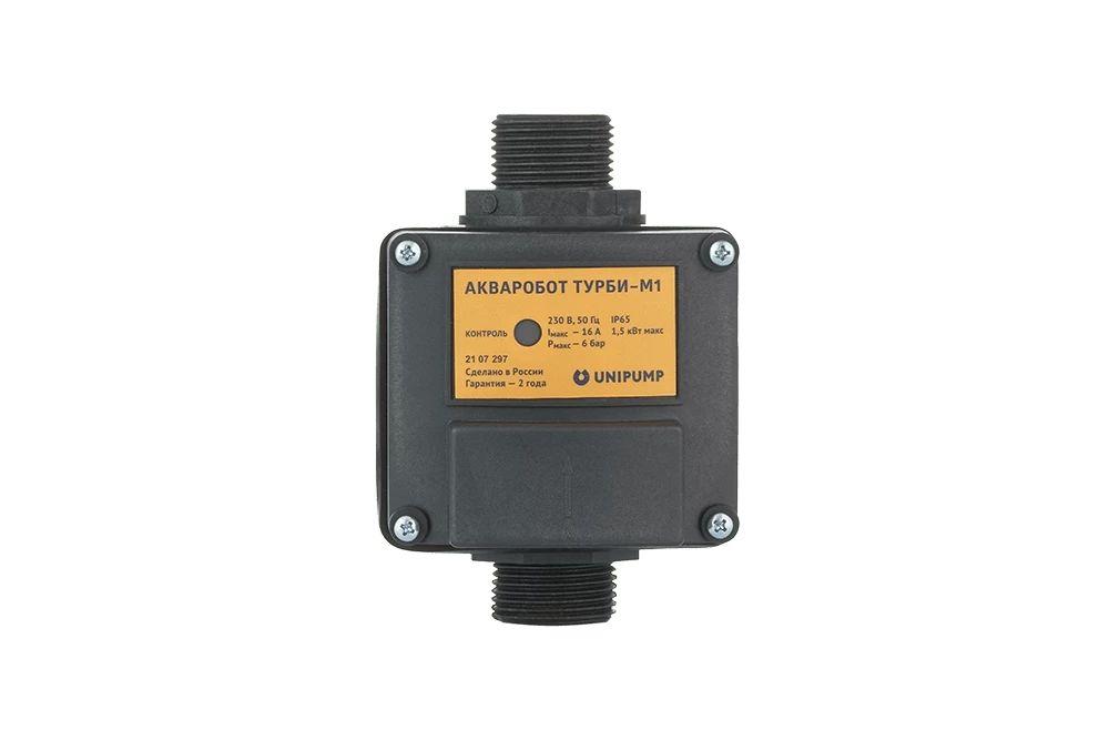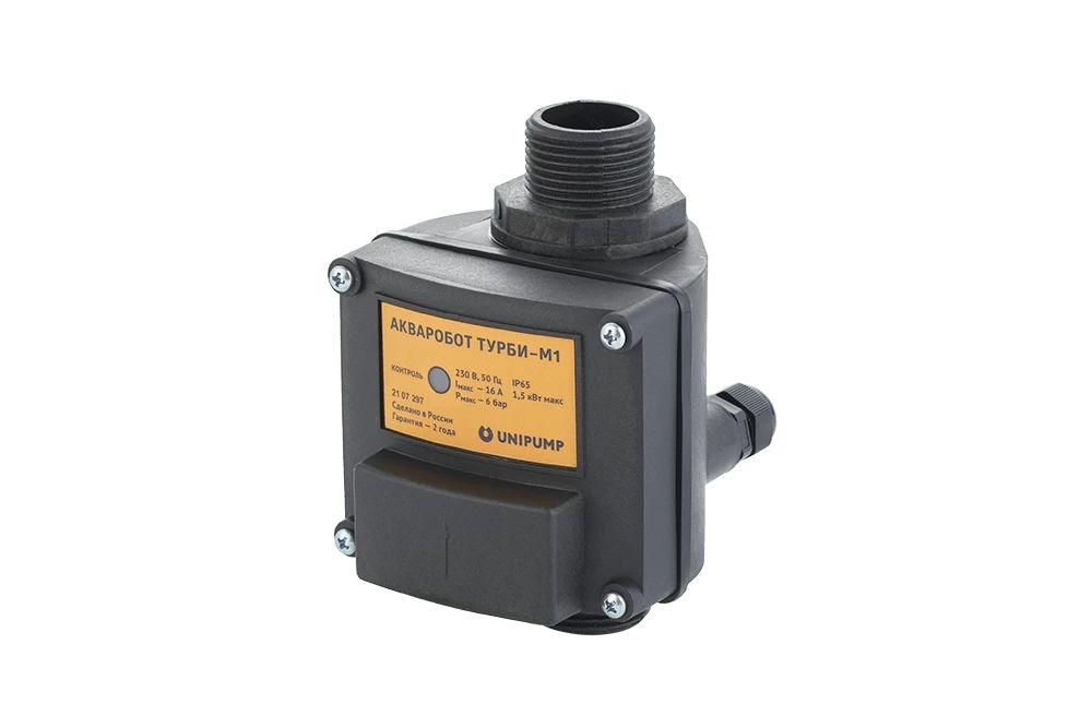 Блок автоматического управления насосом АКВАРОБОТ ТУРБИ-М1, разработан для автоматического управления однофазными насосами мощностью до 1,5 кВт на основе потока жидкости и минимального давления в системе (Pмин).