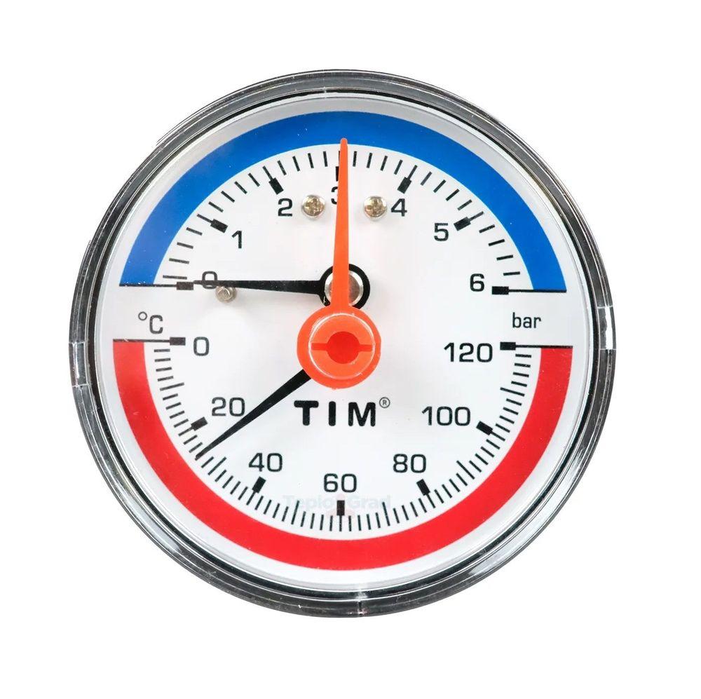 Термоманометр аксиальный TIM, корпус 63 мм, диапазон 0-6 бар, подключение 1/2" (артикул Y-63T-6) используется для измерения давления и температуры в системах отопления и водоснабжения.